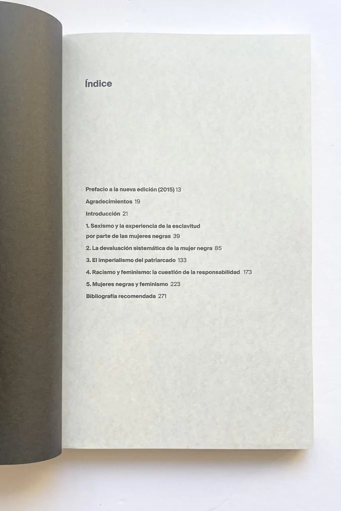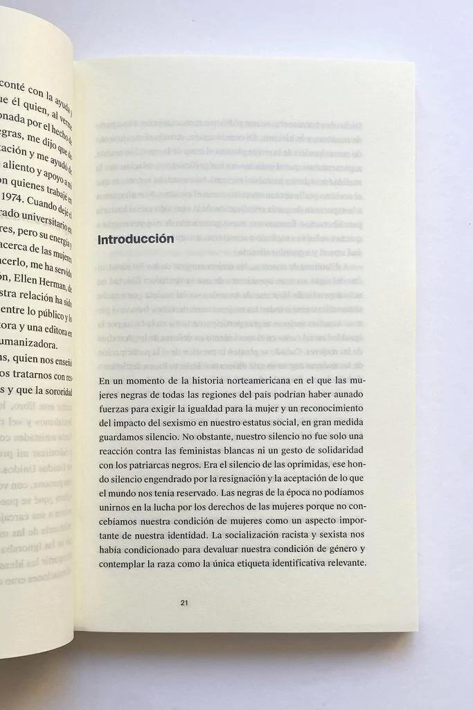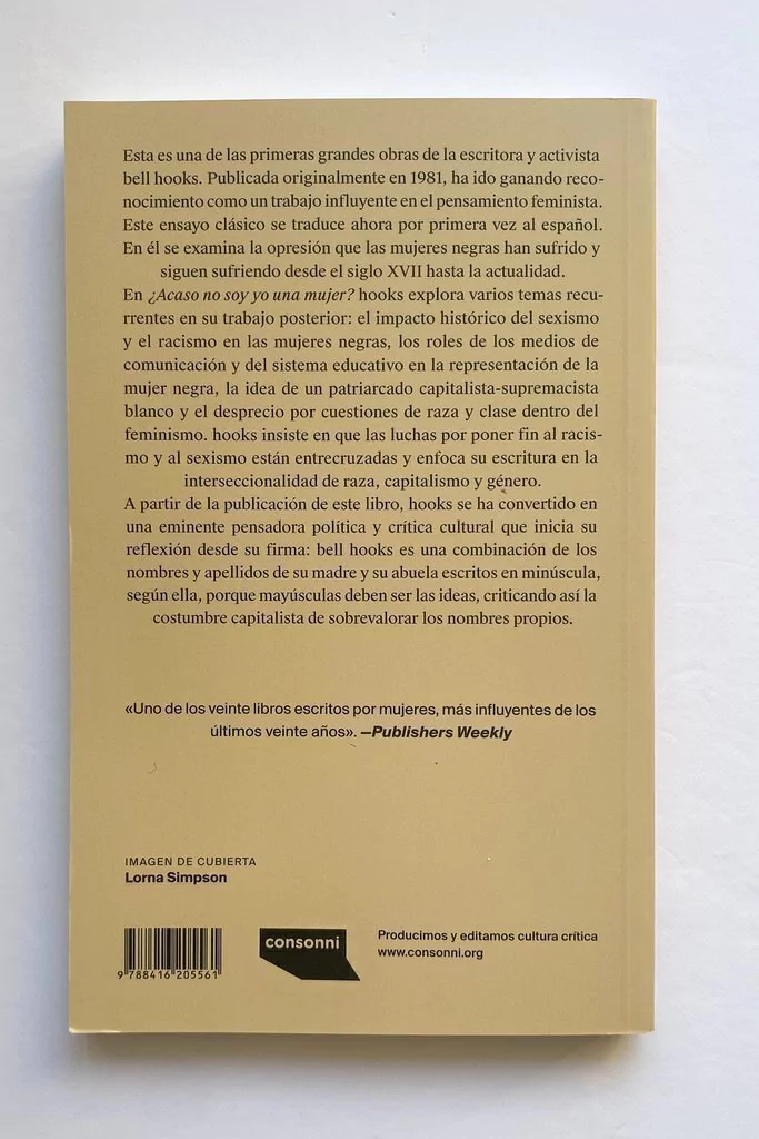 Este ensayo clásico se traduce ahora por primera vez al español. En él se examina la opresión que las mujeres negras han sufrido y siguen sufriendo desde el siglo XVII hasta la actualidad. En ¿Acaso no soy yo una mujer? Hooks explora varios temas recurrentes en su trabajo posterior: el impacto histórico del sexismo y el racismo en las mujeres negras, los roles de los medios de comunicación y del sistema educativo en la representación de la mujer negra, la idea de un patriarcado capitalista-supremacista blanco y el desprecio por cuestiones de raza y clase dentro del feminismo. Hooks insiste en que las luchas por poner fin al racismo y al sexismo están entrecruzadas y enfoca su escritura en la interseccionalidad de raza, capitalismo y género.
