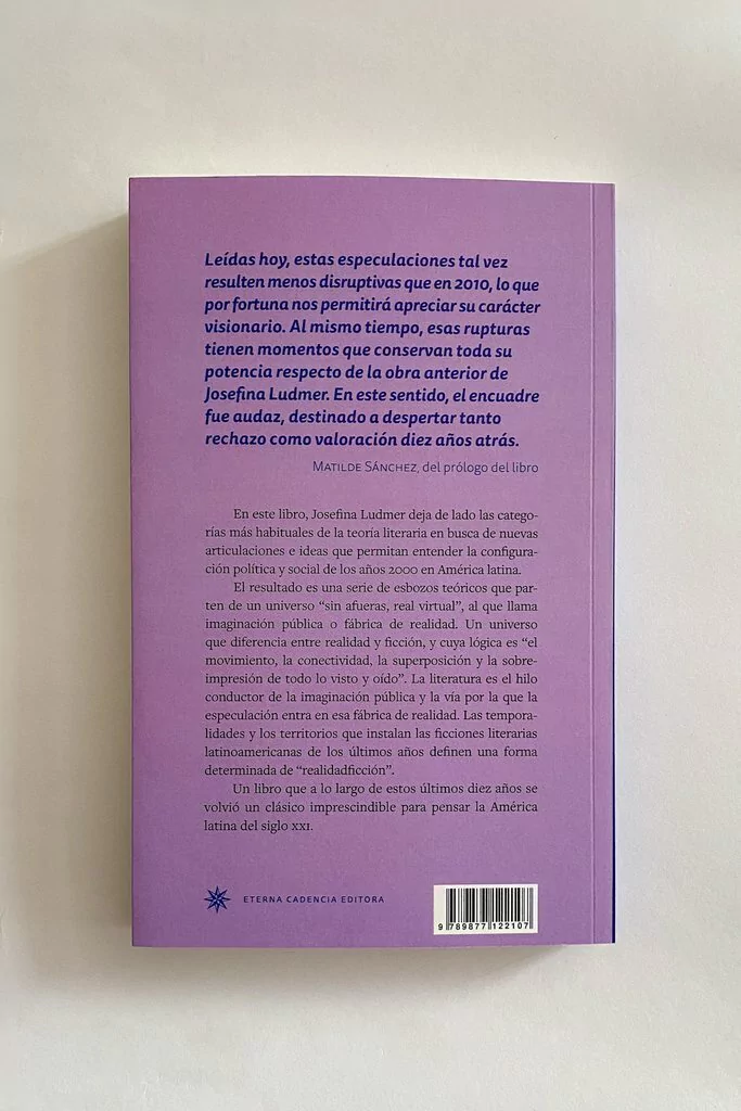 En este libro, Josefina Ludmer deja de lado las categorías más habituales de la teoría literaria en busca de nuevas articulaciones e ideas que permitan entender la configuración política y social de los años 2000 en América latina. El resultado es una serie de esbozos teóricos que parten de un universo “sin afueras, real virtual”, al que llama imaginación pública o fábrica de realidad. Un universo que diferencia entre realidad y ficción, y cuya lógica es “el movimiento, la conectividad, la superposición y la sobreimpresión de todo lo visto y oído”. La literatura es el hilo conductor de la imaginación pública y la vía por la que la especulación entra en esa fábrica de realidad. Las temporalidades y los territorios que instalan las ficciones literarias latinoamericanas de los últimos años definen una forma determinada de “realidadficción”. Un libro que a lo largo de estos últimos diez años se volvió un clásico imprescindible para pensar la América latina del siglo XXI.
