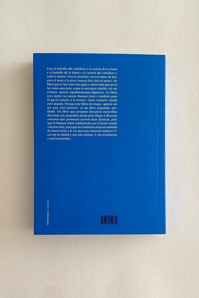Para el bolsillo del caballero y la cartera de la dama y el bolsillo de la dama y la cartera del caballero y todo lo demás. Para la mochila y para la mesa de luz, para el mate y la pizza (nunca fría, dice el autor). Un libro que se lee como una guía y sobre todo que no se lee como una guía, o que es una guía rebelde, tal vez errática, quizás orgullosamente digresiva. Un libro para quien no conoce Buenos Aires y también para el que la conoce, o la conoce –claro, siempre– desde otro ángulo. Porque este libro sin mapa –quizás eso sea una, otra mentira– es un libro angulado, perfilado. Un libro que propone descubrir maravillas discretas con pequeñas pistas para llegar a diversos rincones que prometen tesoros muy diversos, para que la Buenos Aires configurada por el lector pueda volverse otra, para que las caminatas sean un método de observación a la vez que una conexión siempre vital con la ciudad y con uno mismo. Y con el presente y con los pasados.