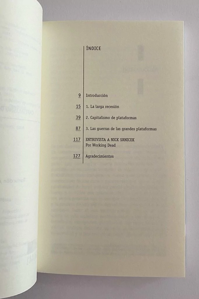 La tesis de este libro es que el capitalismo se volcó hacia los datos para recobrar vitalidad tras las prolongadas crisis de sobrecapacidad que acechan la producción fordista de bienes y su régimen de empleo desde la década de 1970. El propósito de este ensayo es entonces situar el modelo de acumulación que encarnan Google y Facebook, Apple y Microsoft, Siemens y General Electric, Uber y AirBnb, en el contexto de una historia más amplia, para demostrar que datos y plataformas realizan una serie de funciones capitalistas claves, entre las que se destaca su capacidad para impulsar la deslocalización y la precarización de la fuerza de trabajo.