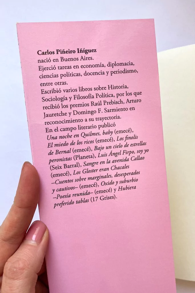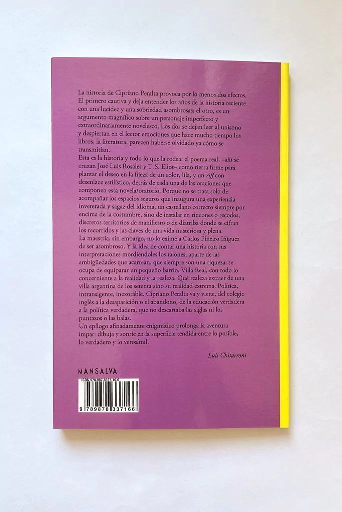 Esta es la historia y todo lo que la rodea: el poema real, –ahí se cruzan José Luis Rosales y T. S. Eliot– como tierra firme para plantar el deseo en la fijeza de un color, lila, y un riff con desenlace estilístico, detrás de cada una de las oraciones que componen esta novela/oratorio. Porque no se trata solo de acompañar los espacios seguros que inaugura una experiencia inveterada y sagaz del idioma, un castellano correcto siempre por encima de la costumbre, sino de instalar en rincones o recodos, discretos territorios de manifiesto o de diatriba donde se cifran los recorridos y las claves de una vida misteriosa y plena. La maestría, sin embargo, no lo exime a Carlos Piñeiro Iñíguez de ser asombroso. Y la idea de contar una historia con sus interpretaciones mordiéndoles los talones, aparte de las ambigüedades que acarrean, que siempre son una riqueza, se ocupa de equiparar un pequeño barrio, Villa Real, con todo lo concerniente a la realidad y la realeza. Qué realeza extraer de una villa argentina de los setenta sino su realidad extrema. Política, intransigente, inexorable. Cipriano Peralta va y viene, del colegio inglés a la desaparición o el abandono, de la educación verdadera a la política verdadera, que no descartaba las siglas ni los puntazos o las balas.