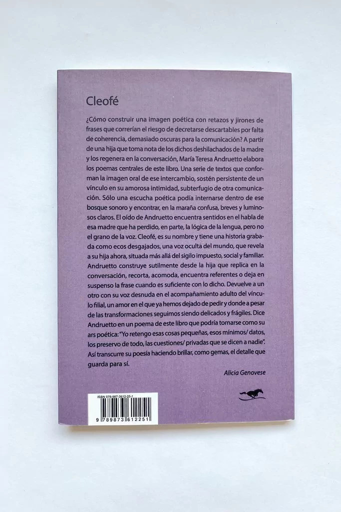 ¿Cómo construir una imagen poética con retazos y jirones de frases que correrían el riesgo de decretarse descartables por falta de coherencia, demasiado oscuras para la comunicación? A partir de una hija que toma nota de los dichos deshilachados de la madre y los regenera en la conversación, María Teresa Andruetto elabora los poemas centrales de este libro. Una serie de textos que conforman la imagen oral de ese intercambio, sostén persistente de un vínculo en su amorosa intimidad, subterfugio de otra comunicación. Sólo una escucha poética podía internarse dentro de ese bosque sonoro y encontrar, en la maraña confusa, breves y luminosos claros. El oído de Andruetto encuentra sentidos en el habla de esa madre que ha perdido, en parte, la lógica de la lengua, pero no el grano de la voz. Cleofé, es su nombre y tiene una historia grabada como ecos desgajados, una voz oculta del mundo, que revela a su hija ahora, situada más allá del sigilo impuesto, social y familiar. Andruetto construye sutilmente desde la hija que replica en la conversación, recorta, acomoda, encuentra referentes o deja en suspenso la frase cuando es suficiente con lo dicho. Devuelve a un otro con su voz desnuda en el acompañamiento adulto del vínculo filial, un amor en el que ya hemos dejado de pedir y donde a pesar de las transformaciones seguimos siendo delicados y frágiles. Dice Andruetto en un poema de este libro que podría tomarse como su ars poética: “Yo retengo esas cosas pequeñas, esos mínimos/ datos, los preservo de todo, las cuestiones/ privadas que se dicen a nadie”. Así transcurre su poesía haciendo brillar, como gemas, el detalle que guarda para sí. -Alicia Genovese