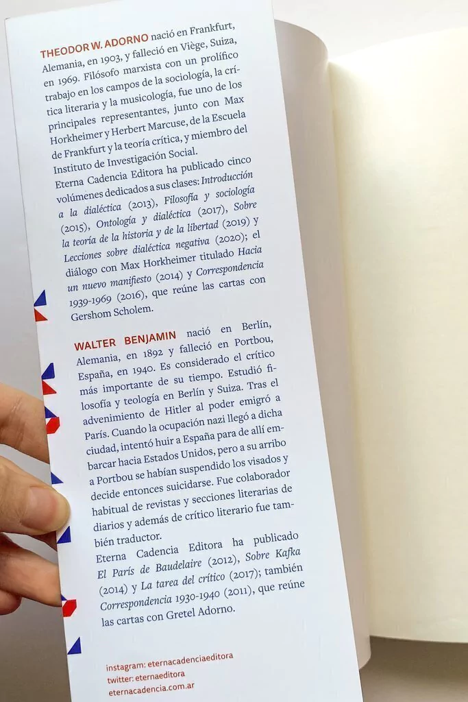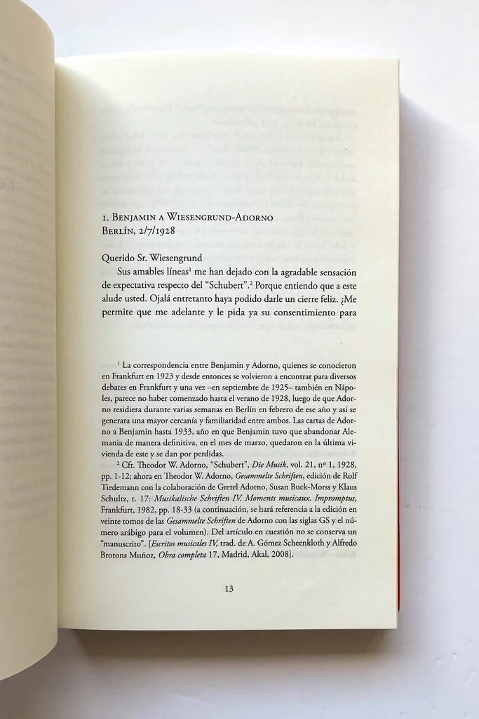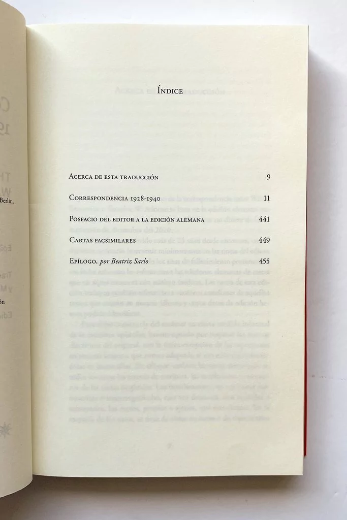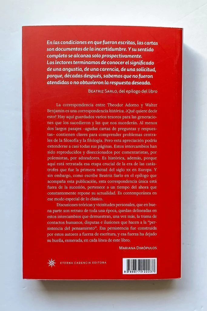 La correspondencia entre Theodor Adorno y Walter Benjamin es una correspondencia histórica. ¿Qué quiere decir esto? Hay aquí guardados varios tesoros para las generaciones que los sucedieron y las que nos sucederán. Al menos dos largos pasajes -agudas cartas de preguntas y respuestas- contienen claves para comprender problemas centrales de la filosofía y la filología. Pero esta apreciación podría extenderse a casi todas sus páginas. Estos intercambios han sido reproducidos y diseccionados por comentaristas, por polemistas, por adoradores. Es histórica, además, porqueaquí está retratada esa etapa crucial de la era de las catástrofes que fue la primera mitad del siglo XX en Europa. Y sin embargo, como escribe Beatriz Sarlo en el epílogo que acompaña esta publicación, esta correspondencia única está fuera de la sucesión, pertenece a un tiempo del ahora que constantemente repone su actualidad. Es contemporánea en ese modo especial de lo clásico.