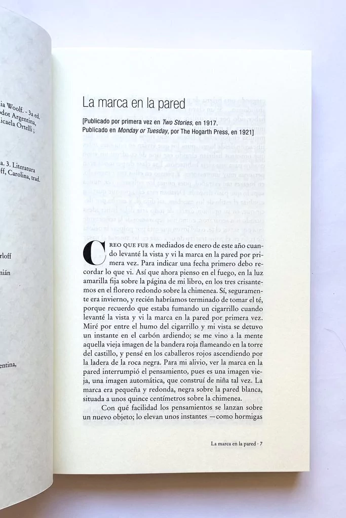 En Cuentos completos se reúnen relatos y cuentos escritos por Virginia Woolf. Autora también de novelas y con una vasta producción ensayística, la literatura de Virginia Woolf puede observarse pulida y prolija a través de sus cuentos y relatos breves, como en La sociedad: “Así comenzó todo. Éramos un grupo de seis o siete reunidas después del té. Algunas miraban hacia la sombrerera de enfrente, donde las plumas rojas y las pantuflas doradas seguían iluminadas en la vidriera; otras dejaban pasar el tiempo construyendo pequeñas torres de azúcar en el borde de la bandeja del té. Pasado un momento, según lo recuerdo, nos ubicamos alrededor del fuego y comenzamos, como de costumbre, a elogiar a los hombres. Qué fuertes, qué nobles, qué inteligentes, qué valientes, qué bellos eran; y cómo envidiábamos a aquellas que, por las buenas o por las malas, lograban unirse a uno de por vida. Hasta que Poll, que había permanecido en silencio hasta el momento, rompió a llorar. Poll, debo admitirlo, siempre ha sido algo extraña. Para empezar, su padre era un hombre extraño. Le dejó una fortuna en su testamento, pero con la condición de que leyera todos los libros de la biblioteca de Londres. Intentábamos consolarla lo mejor que podíamos, pero en el fondo sabíamos que era inútil.”