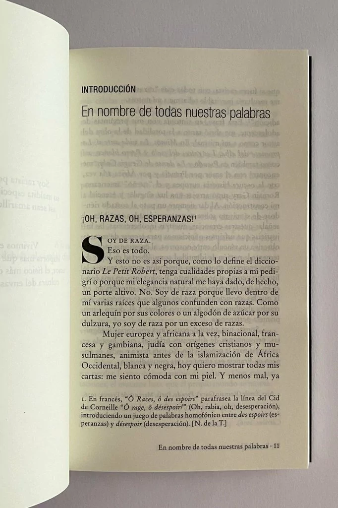 Mujer europea y africana a la vez, binacional, francesa y gambiana, judía con orígenes cristianos y musulmanes, animista antes de la islamización de África occidental, blanca y negra, hoy quiero mostrar todas mis cartas: me siento cómoda con mi piel. Y menos mal, ya que si fuera racista, con todas esas “razas” dentro de mí, me resultaría inevitable odiarme a mí misma.