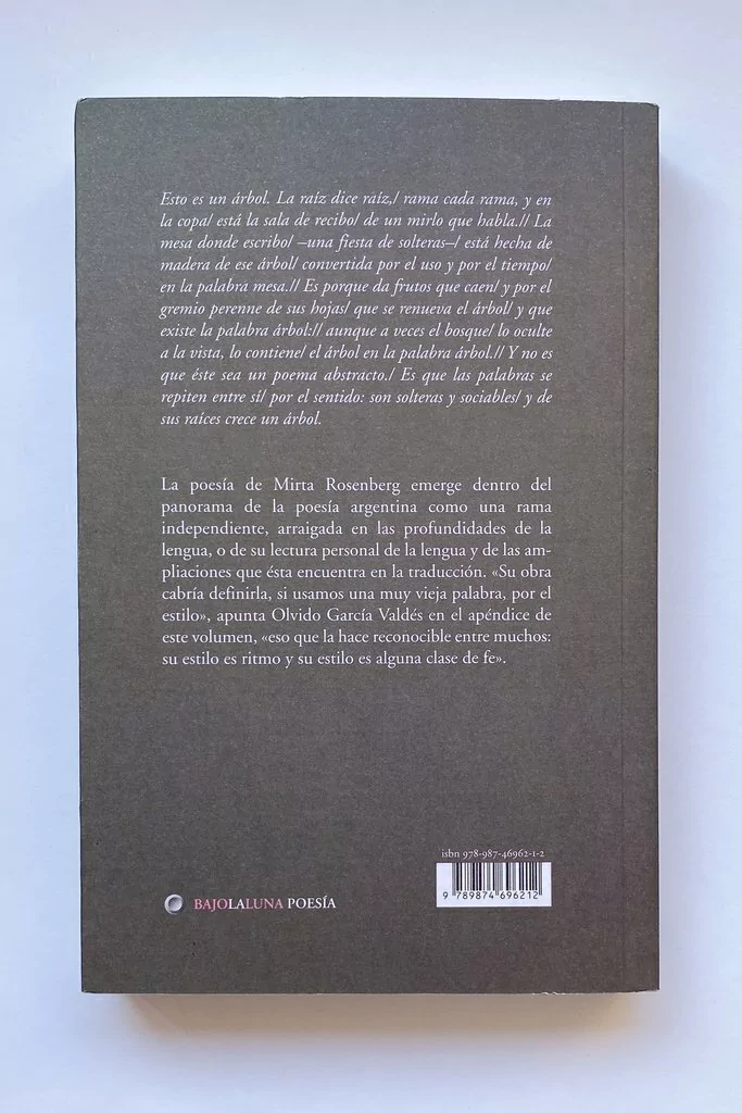 La poesía de Mirta Rosenberg emerge dentro del panorama de la poesía argentina como una rama independiente, arraigada en las profundidades de la lengua, o de su lectura personal de la lengua y de las ampliaciones que esta encuentra en la traducción. Su obra cabría definirla, si usamos una muy vieja palabra, por el estilo, eso que la hace reconocible entre muchos: su estilo es ritmo y su estilo es alguna clase de fe.