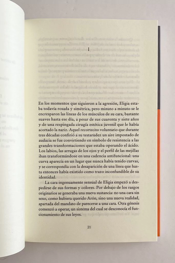 Largamente agotada, esta novela se convirtó al poco tiempo de salir en una novela de culto por la crudeza de la historia y el equilibrio y distanciamiento con que, a pesar de lo autobiográfico, es relatada. Poco después del ataque, en el coche que la lleva de urgencia al hospital, el rostro de Eligia se va desintegrando por el efecto del ácido. A su lado va Mario, su hijo y narrador de los hechos, que desde entonces la acompañará a lo largo del lento proceso de reconstrucción de ese rostro y esa identidad. Una novela que expone el dolor y el horror al punto que parece anular el sentido humano de lo que ocurre; no hay lugar para el drama, solo queda mantener la perspectiva y dejar que la pura facticidad, esa "pintura feroz realizada por un artista embriagado de sus poderes", se transforme en pura literatura.