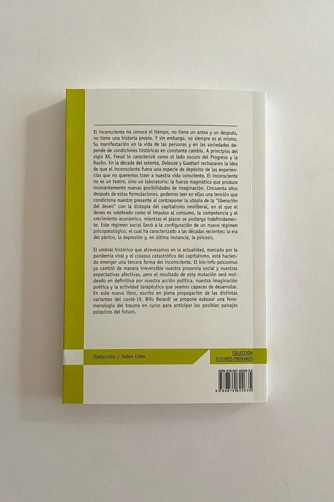 El umbral histórico que atravesamos en la actualidad, marcado por la pandemia viral y el colapso catastrófico del capitalismo, está haciendo emerger una tercera forma del inconsciente. El bio-info-psicovirus ya cambió de manera irreversible nuestra proxemia social y nuestras expectativas afectivas, pero el resultado de esta mutación será moldeado en última instancia por nuestra acción política, nuestra imaginación poética y la actividad terapéutica que seamos capaces de desarrollar. En este nuevo libro, escrito en plena propagación de las distintas variantes del covid-19, Bifo Berardi se propone esbozar una fenomenología del trauma en curso para anticipar los posibles paisajes psíquicos del futuro.