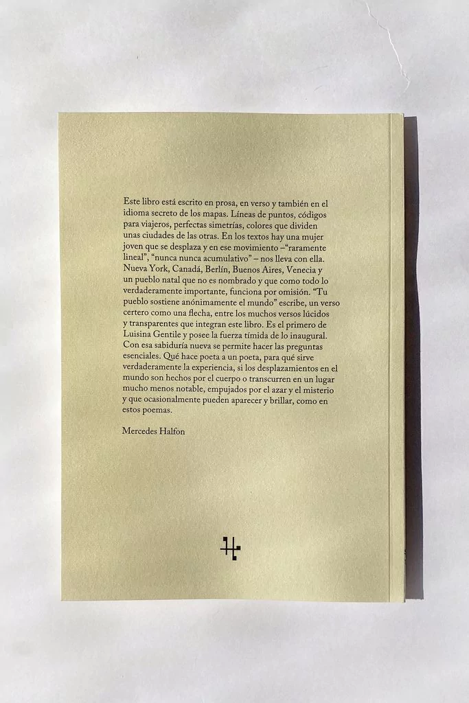 Este libro está escrito en prosa, en verso y también en el idioma secreto de los mapas. Líneas de puntos, códigos para viajeros, perfectas simetrías, colores que dividen unas ciudades de las otras. En los textos hay una mujer joven que se desplaza y en ese movimiento –“raramente lineal”, “nunca nunca acumulativo” – nos lleva con ella. Nueva York, Canadá, Berlín, Buenos Aires, Venecia y un pueblo natal que no es nombrado y que como todo lo verdaderamente importante, funciona por omisión. “Tu pueblo sostiene anónimamente el mundo” escribe, un verso certero como una flecha, entre los muchos versos lúcidos y transparentes que integran este libro. Es el primero de Luisina Gentile y posee la fuerza tímida de lo inaugural. Con esa sabiduría nueva se permite hacer las preguntas esenciales. Qué hace poeta a un poeta, para qué sirve verdaderamente la experiencia, si los desplazamientos en el mundo son hechos por el cuerpo o transcurren en un lugar mucho menos notable, empujados por el azar y el misterio y que ocasionalmente pueden aparecer y brillar, como en estos poemas.