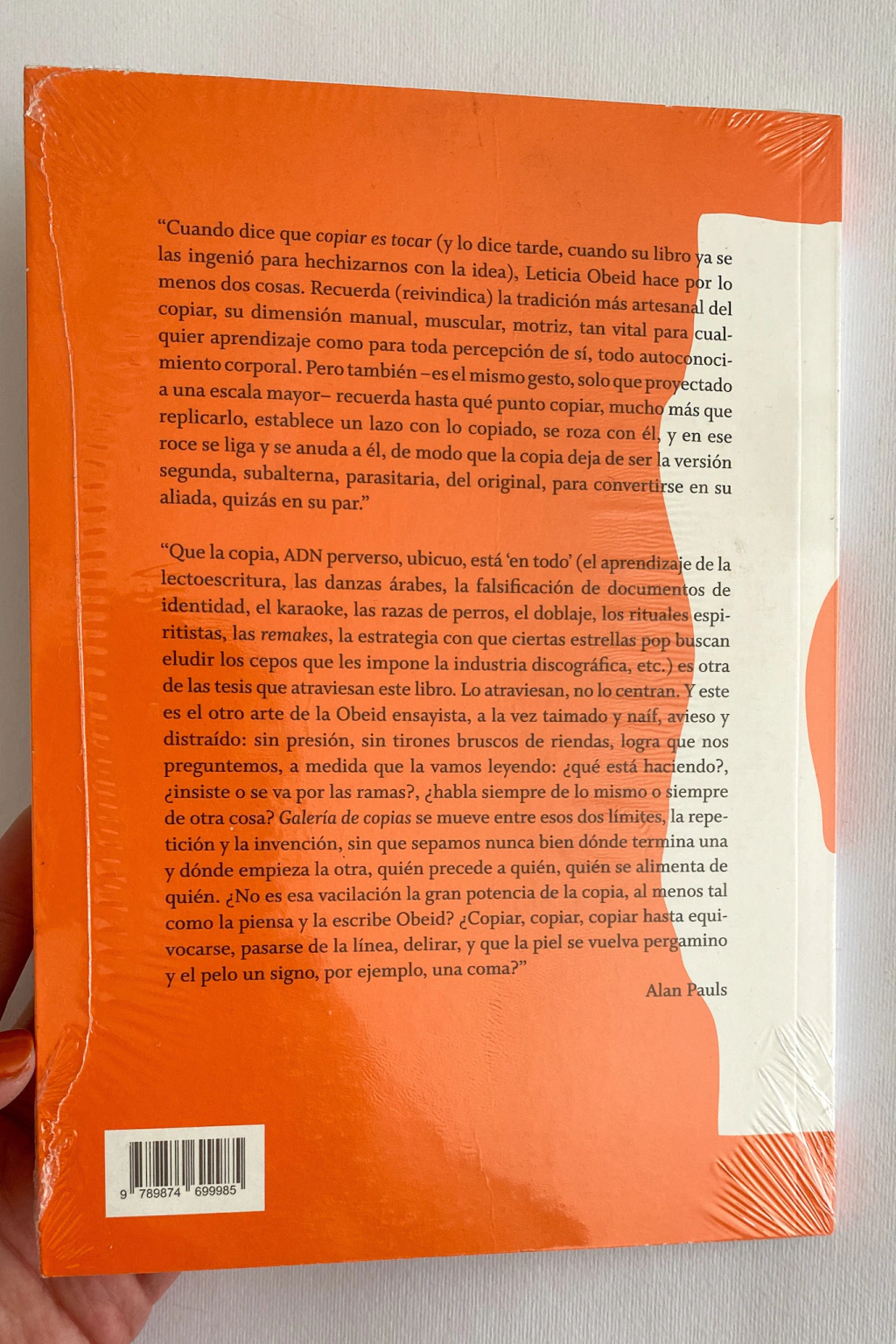 “Que la copia, ADN perverso, ubicuo, está ‘en todo’ (el aprendizaje de la lectoescritura, las danzas árabes, la falsificación de documentos de identidad, el karaoke, las razas de perros, el doblaje, los rituales espiritistas, las remakes, la estrategia con que ciertas estrellas pop buscan eludir los cepos que les impone la industria discográfica, etc.) es otra de las tesis que atraviesan este libro. Lo atraviesan, no lo centran. Y este es el otro arte de la Obeid ensayista, a la vez taimado y naíf, avieso y distraído: sin presión, sin tirones bruscos de riendas, lograr que nos preguntemos, a medida que la vamos leyendo: ¿qué está haciendo?, ¿insiste o se va por las ramas?, ¿habla siempre de lo mismo o siempre de otra cosa? Galería de copias se mueve entre esos dos límites, la repetición y la invención, sin que sepamos nunca bien dónde termina una y dónde empieza la otra, quién precede a quién, quién se alimenta de quién. ¿No es esa vacilación la gran potencia de la copia, al menos tal como la piensa y la escribe Obeid? ¿Copiar, copiar, copiar hasta equivocarse, pasarse de la línea, delirar, y que la piel se vuelva pergamino y el pelo un signo, por ejemplo, una coma?”