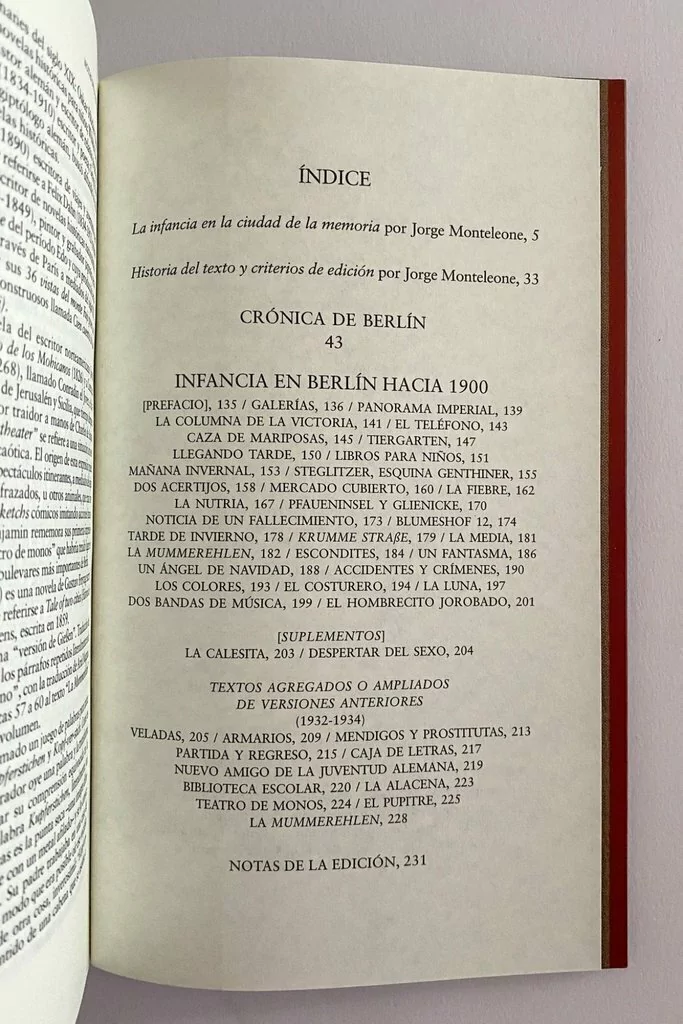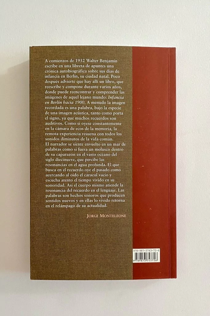 “A comienzos de 1932 Walter Benjamin escribe en una libreta de apuntes una crónica autobiográfica sobre sus días de infancia en Berlín, su ciudad natal. A menudo la imagen recordada es una palabra, bajo la especie de una imagen acústica, tanto como porta el signo, ya que muchos recuerdos son auditivos. Como si oyese constantemente en la cámara de ecos de la memoria, la remota experiencia resuena con todos los sonidos diminutos de la vida común. El narrador se siente envuelto en un mar de palabras como si fuera un molusco dentro de su caparazón en el vasto océano del siglo diecinueve, que percibe las resonancias en el agua profunda. El cuerpo mismo atiende la resonancia del recuerdo en el lenguaje. Las palabras son hechos sonoros que producen sentidos nuevos y en ellas lo vivido retorna en el relámpago de su actualidad.”