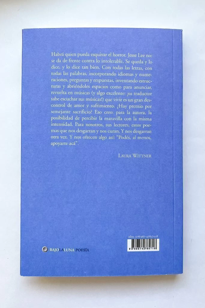Habrá quien pueda esquivar el horror. Jesse Lee no: se da de frente contra lo intolerable. Se queda y lo dice, y lo dice tan bien. Con todas las letras, con todas las palabras, incorporando idiomas y numeraciones, preguntas y respuestas, inventándoles estructuras y abriéndoles espacios como para anunciar, revuelta en músicas (y algo excelente: ¡su traductor sabe escuchar sus músicas!) que vivir es un gran descontrol se amor y sufrimiento. ¿Hay premio por semejante sacrificio? Eso creo: para la autora, la posibilidad de percibir la maravilla con la misma intensidad. Para nosotros, sus lectores, estos poemas que nos desgarran y nos curan. Y nos desgarran otra vez. Y nos ofrecen algo así: “Podés, al menos, apoyarte acá”.