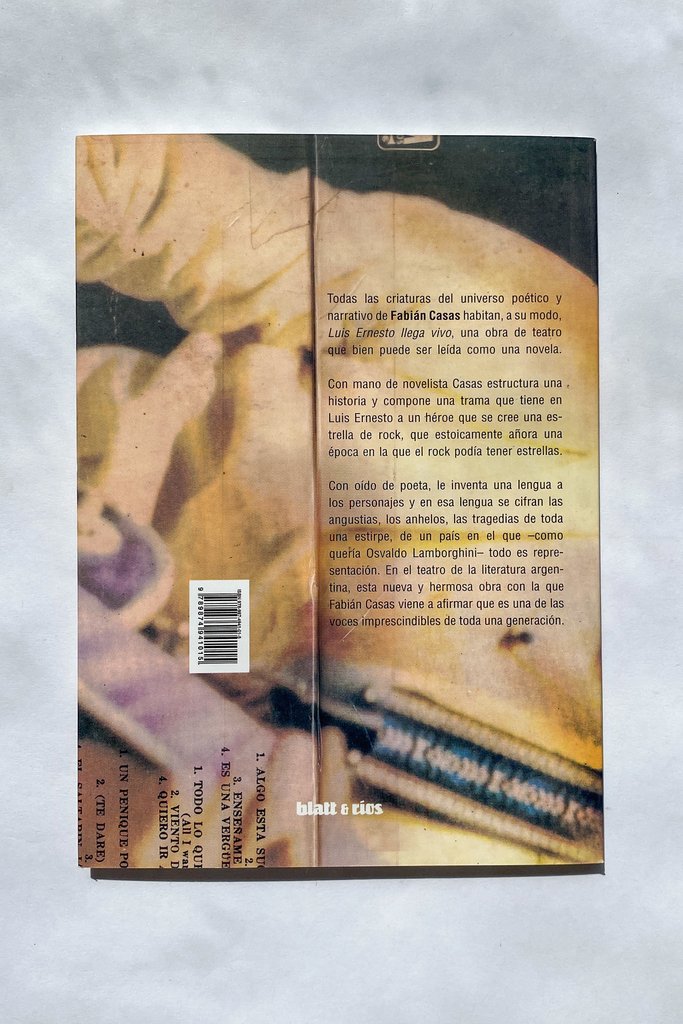 Todas las criaturas del universo poético y narrativo de Fabián Casas habitan, a su modo, Luis Ernesto llega vivo, una obra de teatro que bien puede ser leída como una novela. Con mano de novelista Casas estructura una historia y compone una trama que tiene en Luis Ernesto a un héroe que se cree una estrella de rock, que estoicamente añora una época en la que el rock podía tener estrellas. Con oído de poeta, le inventa una lengua a los personajes y en esa lengua se cifran las angustias, los anhelos, las tragedias de toda una estirpe, de un país en el que –como quería Osvaldo Lamborghini– todo es representación. En el teatro de la literatura argentina, esta nueva y hermosa obra con la que Fabián Casas viene a afirmar que es una de las voces imprescindibles de toda una generación.