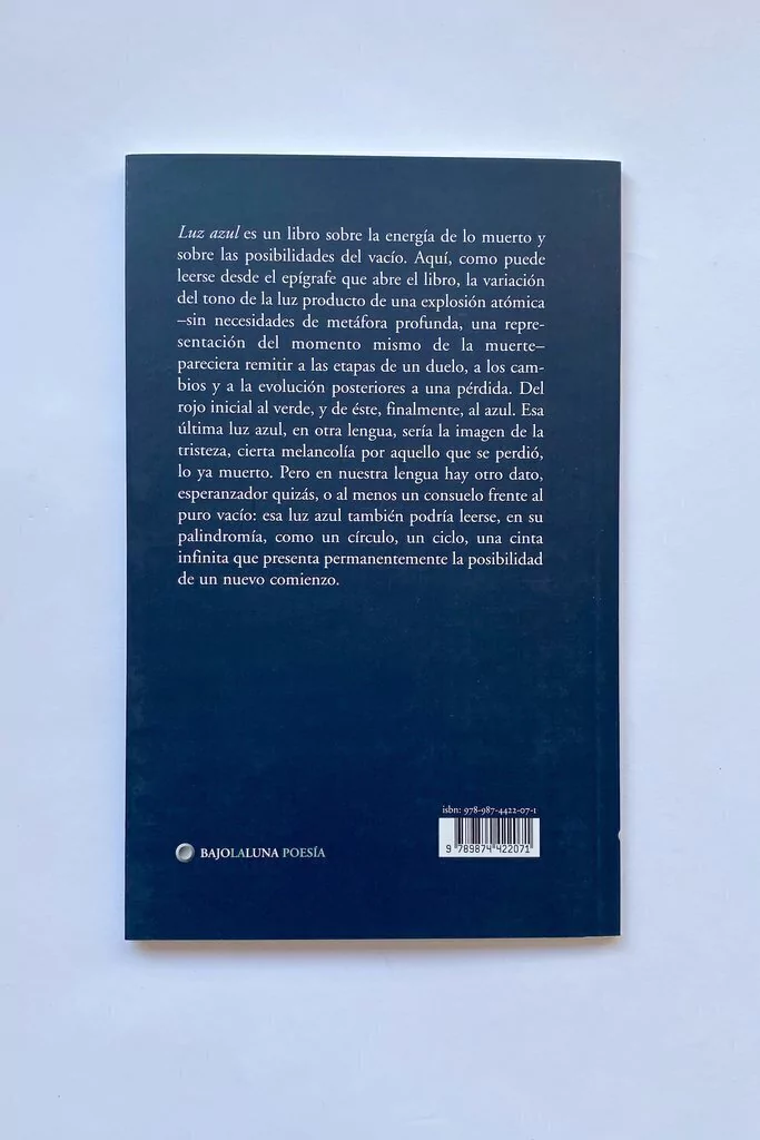 Luz azul es un libro sobre la energía de lo muerto y sobre las posibilidades del vacío. Aquí, como puede leerse desde el epígrafe del libro, la variación del tono de la luz producto de una explosión atómica -sin necesidades de metáfora profunda, una representación del momento mismo de la muerte- pareciera remitir a las etapas de un duelo, a los cambios y a la evolución posteriores a una pérdida. Del rojo inicial al verde, y de éste, finalmente, al azul. Esa última luz azul, en otra lengua, sería la imagen de la tristeza, cierta melancolía por aquello que se perdió, lo ya muerto. Pero en nuestra lengua hay otro dato, esperanzador quizás, o al menos un consuelo frente al puro vacío: esa luz también podrá leerse, en su palindromía, como un círculo, una cinta infinita que presenta permanentemente la posibilidad de un nuevo comienzo.