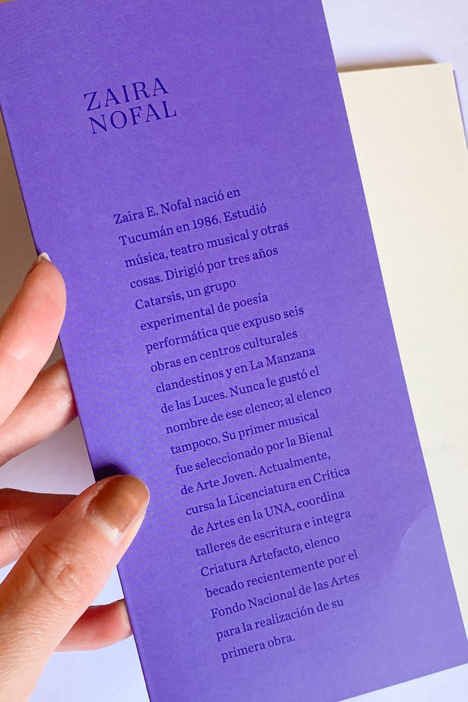 Zaira E. Nofal nació en Tucumán en 1986. Estudió música, teatro musical y otras cosas. Dirigió por tres años Catarsis, un grupo experimental de poesía performática que expuso seis obras en centros culturales clandestinos y en La Manzana de las Luces. Nunca le gustó el nombre de ese elenco; al elenco tampoco. Su primer musical fue seleccionado por la Bienal de Arte Joven. Actualmente, cursa la Licenciatura en Crítica de Artes en la UNA, coordina talleres de escritura e integra Criatura Artefacto, elenco becado recientemente por el Fondo Nacional de las Artes para la realización de su primera obra.