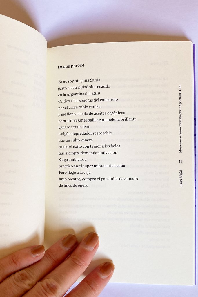 "Durante una época, Zai dirigió un elenco de poetas que se reunían los domingos a experimentar con el pasaje de lo escrito a lo oral. En ese grupo estaba yo y, de hecho, ella me enseñó a encontrar matices a la hora de leer, que me sustraían del habitual tono monocorde. Quiero decir, me regaló un mundo. Acá pasa algo similar. El poema no transa con las convenciones de época en tanto mínimo o realista, sino como algo superior. Zaira nos regala mundos que se abren y cierran como designios celestiales brotando del supermercado. Habitando realidades personales paralelas, Merecemos como mínimo que un portal se abra habilita una experiencia en lo siguiente al humanismo. En el apocalipsis tercermundista en el que estamos, estos poemas escritos a lo largo de los años revelan su absoluta trascendencia y su inquietante poder visionario.