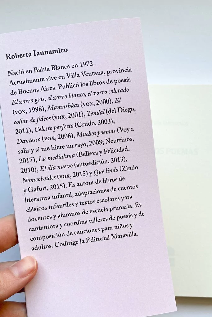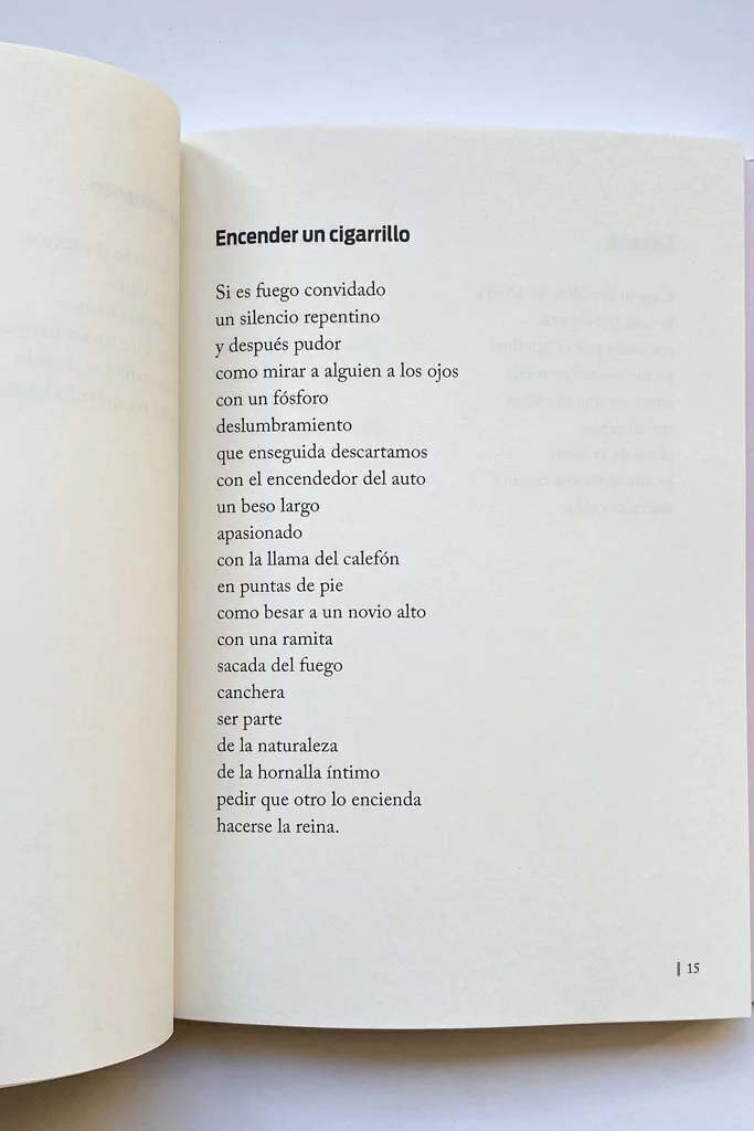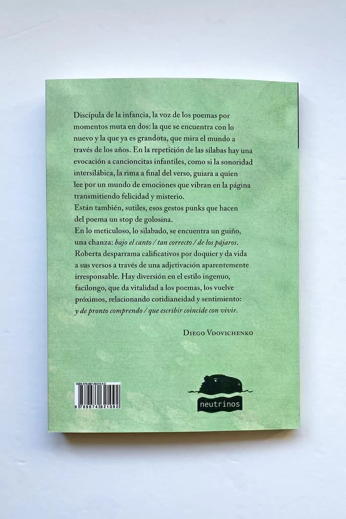 Discípula de la infancia, la voz de los poemas por momentos muta en dos: la que se encuentra con lo nuevo y la que ya es grandota, que mira el mundo a través de los años. En la repetición de las sílabas hay una evocación a cancioncitas infantiles, como si la sonoridad intersilábica, la rima a final del verso, guiara a quien lee por un mundo de emociones que vibran en la página transmitiendo felicidad y misterio. Están también, sutiles, esos gestos punks que hacen del poema un stop de golosina. En lo meticuloso, lo silabado, se encuentra un guiño, una chanza: bajo el canto / tan correcto / de los pájaros. Roberta desparrama calificativos por doquier y da vida a sus versos a través de una adjetivación aparentemente irresponsable. Hay diversión en el estilo ingenuo, facilongo, que da vitalidad a los poemas, los vuelve próximos, relacionando cotidianeidad y sentimiento: y de pronto comprendo / que escribir coincide con vivir.