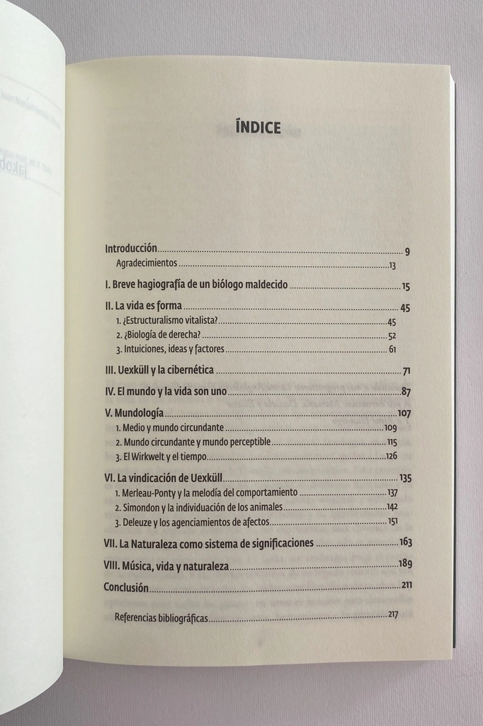 Tenemos aquí una presentación de von Uexküll como fundador de la “etología”, ese campo llamado a generalizarse como teoría no esencialista de los comportamientos de la totalidad de los seres que pueblan los mundos. Encontramos el fuerte vínculo entre las teorías uexküllianas del comportamiento y los modelos cibernéticos que eclosionaron luego y modificaron enteramente nuestros modos de percepción, acción y significación. Mérito no menor de este libro es haber sabido “aislar”, entre las muchísimas lecturas filosóficas de Uexküll, aquellas que lograron “tomar el relevo”, o “la flecha lanzada” y llevarla hacia adelante: la teoría del comportamiento de Merleau-Ponty, la individuación en Simondon y la teoría de los afectos y los agenciamientos de Deleuze. Por último, el lugar de la música en la obra de Uexküll y sobre todo el papel crucial del “contrapunto” en la sinfonía de la naturaleza.