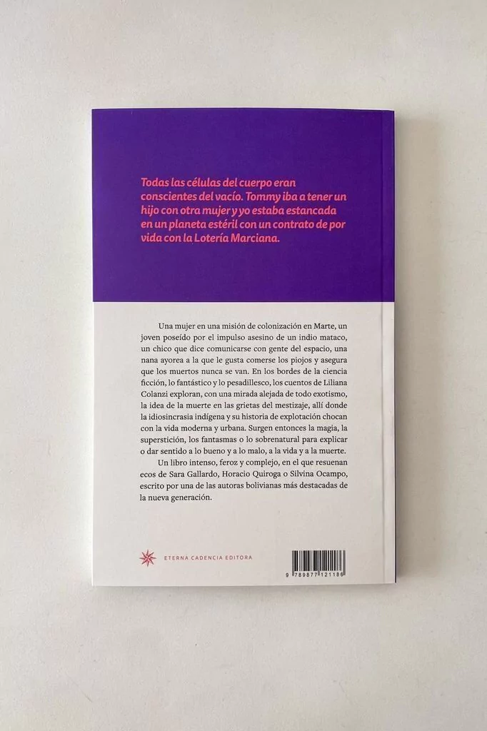 Una mujer en una misión de colonización en Marte, un joven poseído por el impulso asesino de un indio mataco, un chico que dice comunicarse con gente del espacio, una nana ayorea a la que le gusta comerse los piojos y asegura que los muertos nunca se van. En los bordes de la ciencia ficción, lo fantástico y lo pesadillesco, estos cuentos exploran, con una mirada alejada de todo exotismo, la idea de la muerte en las grietas del mestizaje, allí donde la idiosincrasia indígena y su historia de explotación chocan con la vida moderna y urbana.