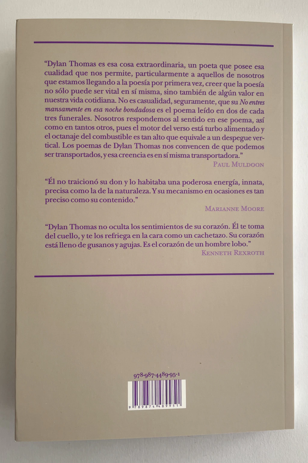 “Dylan Thomas es esa cosa extraordinaria, un poeta que posee esa cualidad que nos permite, particularmente a aquellos de nosotros que estamos llegando a la poesía por primera vez, creer que la poesía no solo puede ser vital en sí misma, sino también de algún valor en nuestra vida cotidiana. No es casualidad, seguramente, que su No entres mansamente en esa noche bondadosa es el poema leído en dos de cada tres funerales. Nosotros respondemos al sentido en ese poema, así como en tantos otros, pues el motor del verso está turbo alimentado y el octanaje del combustible es tan alto que equivale a un despegue vertical. Los poemas de Dylan Thomas nos convencen de que podemos ser transportados, y esa creencia es en sí misma transportadora.”