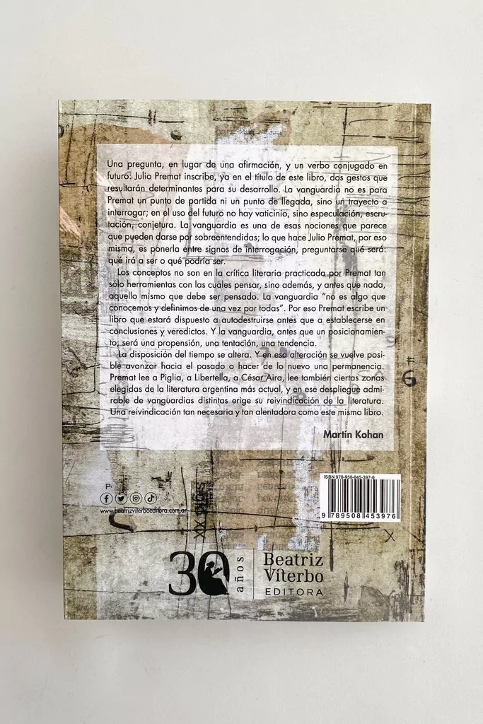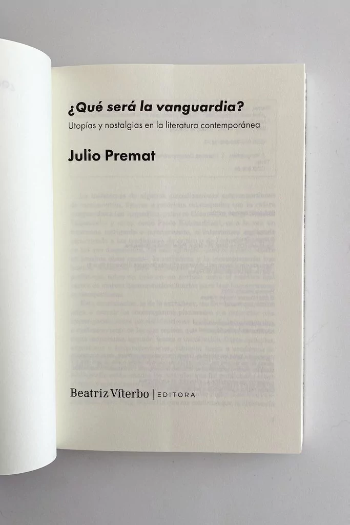 La vanguardia no es para Premat un punto de partida ni un punto de llegada, sino un trayecto a interrogar; en el uso del futuro no hay vaticinio, sino especulación, escrutación, conjetura. La vanguardia es una de esas nociones que parece que pueden darse por sobreentendidas; lo que hace Julio Premat, por eso mismo, es ponerla entre signos de interrogación, preguntarse qué será: qué irá a ser o qué podría ser.