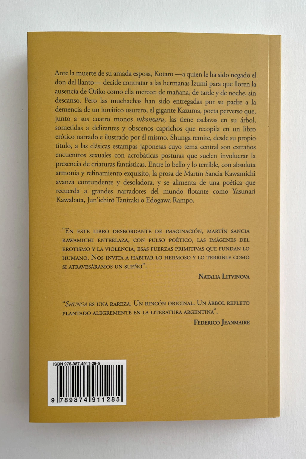 Ante la muerte de su amada esposa, Kotaro —a quien le ha sido negado el don del llanto— decide contratar a las hermanas Izumi para que lloren la ausencia de Oriko como ella merece: de mañana, de tarde y de noche, sin descanso. Pero las muchachas han sido entregadas por su padre a la demencia de un lunático usurero, el gigante Kazuma, poeta perverso que, junto a sus cuatro monos nihonzaru, las tiene esclavas en su árbol, sometidas a delirantes y obscenos caprichos que recopila en un libro erótico narrado e ilustrado por él mismo. Shunga remite, desde su propio título, a las clásicas estampas japonesas cuyo tema central son extraños encuentros sexuales con acrobáticas posturas que suelen involucrar la presencia de criaturas fantásticas.