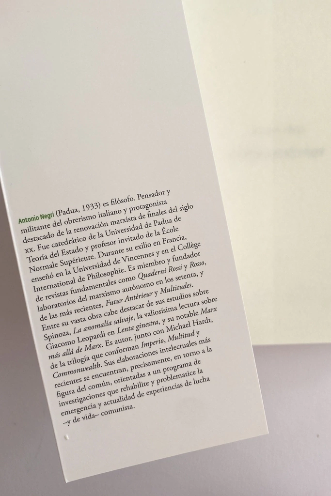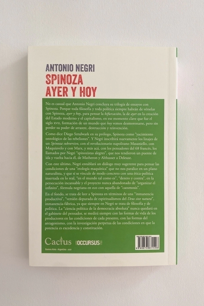 No es casual que Antonio Negri concluya su trilogía de ensayos con Spinoza. Porque toda filosofía y toda política siempre habrán de vérselas con Spinoza, ayer y hoy, para pensar la bifurcación, la de ayer en la creación del Estado moderno y el capitalismo, en ese momento clave que fue el siglo XVII, formación de un mundo que hoy vemos desmoronarse, pero sin perder su poder de arrastre, destrucción y reinvención.